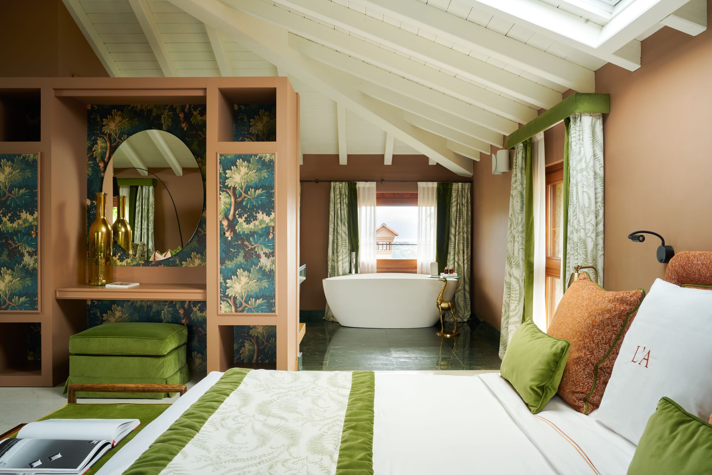The Panorama Suite is located on the top floor of the Torre Contadi tower and enjoys a unique view. The windows overlook the Vigna Leone vineyard on one side and Lake Iseo and the Torre Bellavista tower on the other. The Suite, decorated in shades of antique pink and green, is divided into two large open spaces: a refined living room and a cosy sleeping area. The bathroom features fine green marble finishes and has a freestanding bathtub and large shower.